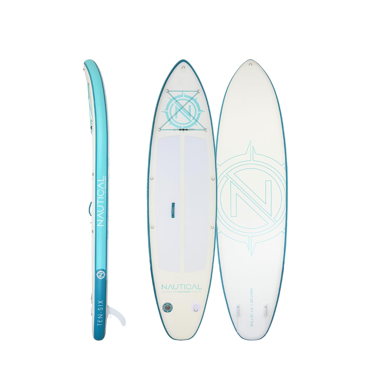 The iROCKER Nautical paddle board includes a sturdy construction with military-grade PVC. It has a comfortable deck pad, bungee storage areas, and multiple D-rings for attachments. The board is lightweight and easy to carry, making it suitable for beginners and frequent travelers.